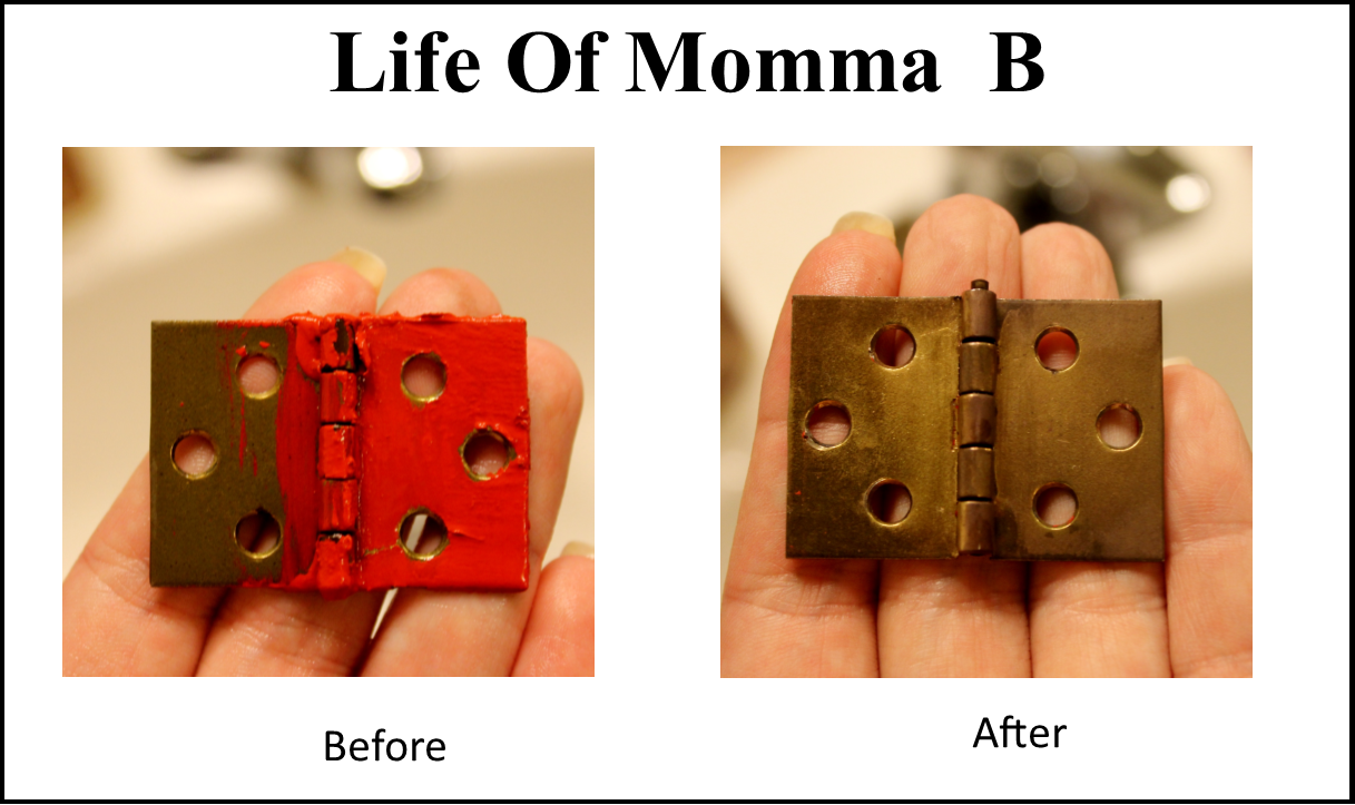 Here is a review of how we removed the red paint. We began with her large 6 quart slow-cooker and used a slow-cooker liner (Reynolds brand). We filled it half full with water and a cap full of laundry detergent (All brand). We placed two hinges and the twelve screws in the pot and set it on high for eight hours and headed out for a day of sight-seeing. When we returned we were able to use a toothbrush and scrub the paint off.