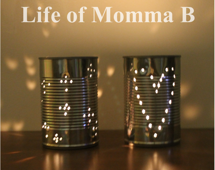 To complete her Our Heritage Merit Badge, my daughter and my niece made tin punch lanterns. We began with a tin can. Be sure to use a safety can opener – these open the can without creating a sharp edge. After the cans were clean and dried, they used a sharpie to mark their design. Using a sharp nail and a hammer, the girls created holes in the can. We placed a tea light candle in the bottom of each. The light was able to penetrate the holes and created beautiful patterns on the wall.