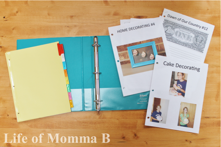 As she completes a requirement, the information is filed. If it is something that can not be filed, such as cake decorating, we take a picture and print it on a piece of paper along with the merit badge name and requirement number.  The paper is then filed into the corresponding tab. The pages are organized by badge name (alphabetically and numerically).