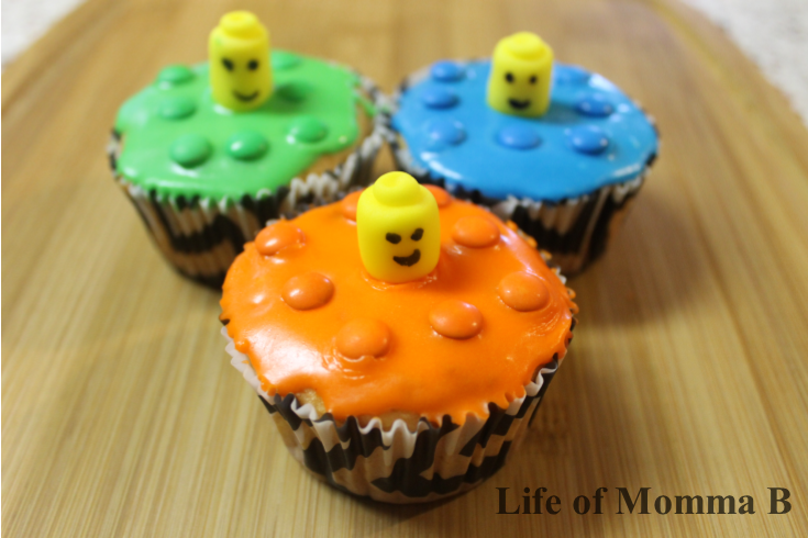 First she created the Lego heads using fondant. The faces were added with a food-safe marker. The cupcakes were topped with a simple glaze colored to match mini-M&M candies.