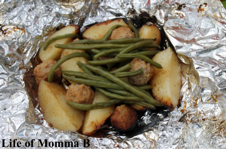 The foil meal pictured above includes new potatoes, meatballs and green beans. I add season salt to add a little flavor.