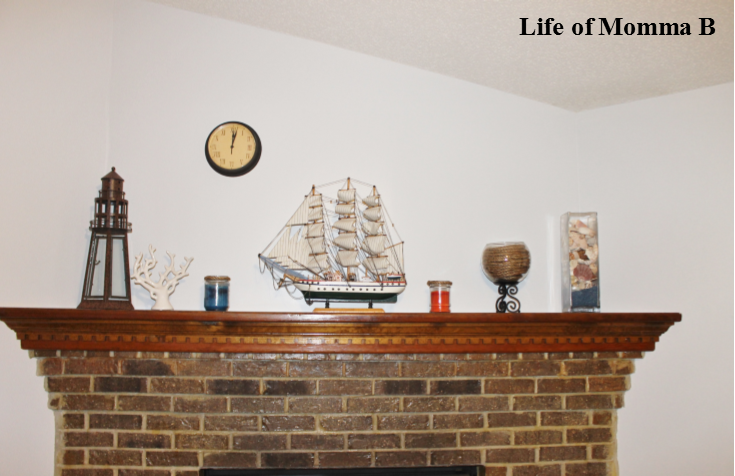 My mantle is a combination of new, old and crafty. The lighthouse and white coral on the left was purchased from At Home. The boat in the middle was found laying around my dad’s house. The other items were little crafty projects that I worked on.