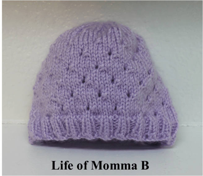 I am continuing to knit purple baby hats. This adorable lace eyelet hat is another variation on preemie hat pattern by Carissa Knits.