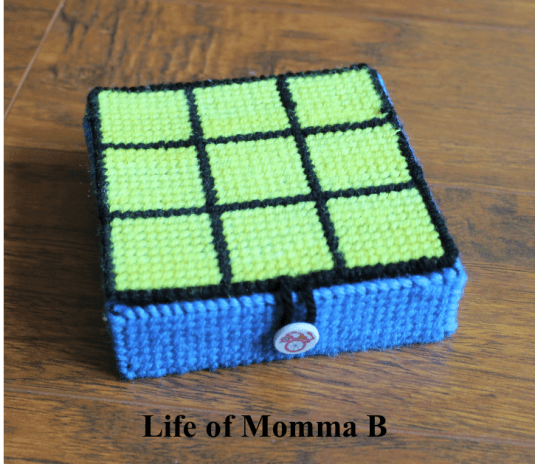 I am not going to give detailed instructions as I assume you can figure that out on your own.  I will say that the yellow squares on the top of the box are 9×9.  Also, I did not stitch the bottom of the box.  The main areas were completed using the basic continental stitch, but the possibilities and color patterns are only limited by your imagination. The X’s and O’s were embroidered after the pieces were completed but a simple back stitch would also work well.