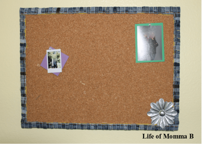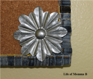 This was a quick project for her. She began by giving the previously purple frame a fresh coat of paint. Then using a hot glue gun she attached the belt loops around the edge of the frame. To finish out the frame and to add a little flair, she added a galvanized metal flower.