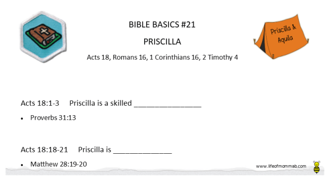 As I shared previously, our PiPa unit has just finished the Bible Basics merit badge. To complete requirement #21 we examined the life of Priscilla.