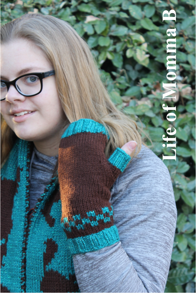 I used a free-pattern that I have used several other times. If you would like the pattern, it can be found on Ravelry (here). This is a fabulous pattern and can easily be altered to match any project. I have used it to create a pair of speckled mitts, and a solid purple pair.